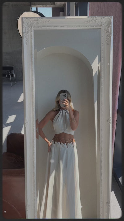 חליפת מיקונוס היא סט הכולל חצאית מקסי וטופ קרופ תואם, המציע מראה בלתי נשכח, סקסי ומלא שיק. הסט עשוי מבד קליל וזורם בגוון בז' עדין, המשתלב באופן מושלם עם עיטורי זהב ייחודיים.