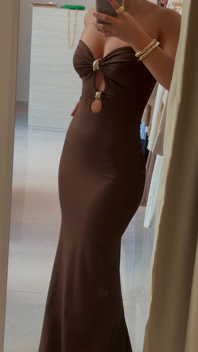 שמלת מקסי סטרפלס בעיטור של אלמנט זהב כפול מקדימה עם שסע מאחורה מבד מחטב ואיכותי